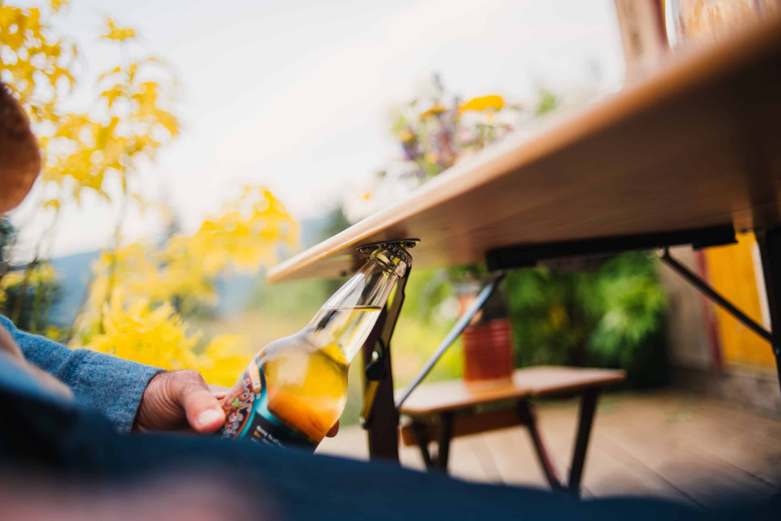 - UNIQUE FOLDING TABLE: Take a load off and relax with this easy foldable table. This camp table has 3 different height adjustments and an integrated bottle opener. There are also table cut outs in the wood for holding 2 stemmed wine glasses.